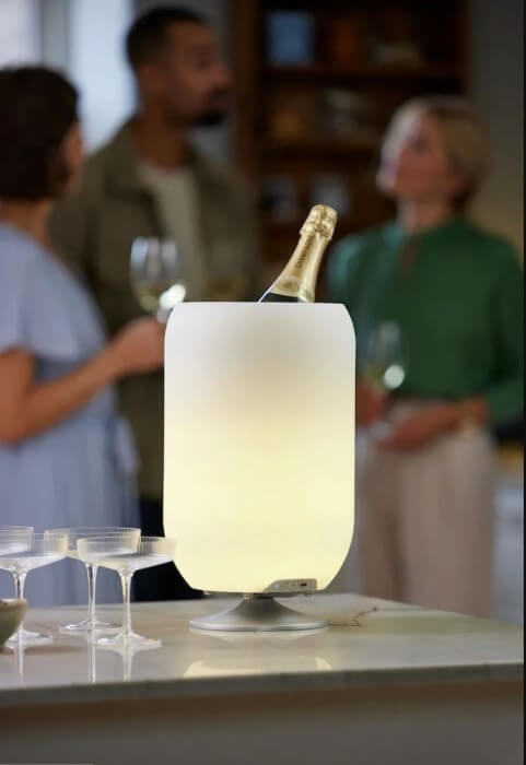 Kooduu Atmos Brass è un altoparlante Bluetooth, una lampada e un portabevande in uno, e ha un aspetto interessante grazie alla sua forma cilindrica minimalista. Il suo design piccolo e pratico è adatto per 2 normali bottiglie di vino ed emette luce calda e regolabile e un suono chiaro grazie al modulo integrato Kooduu Bright Sound Technology™. È stato progettato da Jacob Jensen Design Studio in Danimarca.