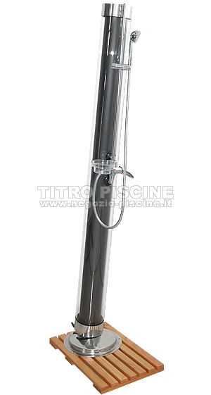 La doccia solare curva San Marino e composta dal serbatoio per l'acqua colorato di nero, realizzato in INOX 316 materiala, oltre il quale passa un tubo trasparente in metacrilato (plastica trasparente). Grazie alla sua forma, la doccia solare assorbe la potenza dei raggi solari a 360°. La doccia solare dispone di miscelatore per l'acqua calda e fredda. Ha inoltre il rubinetto per lo svuotamento con presa filettata, adatta per il collegamento del tubo da giardino e quindi facilmente smontabile.