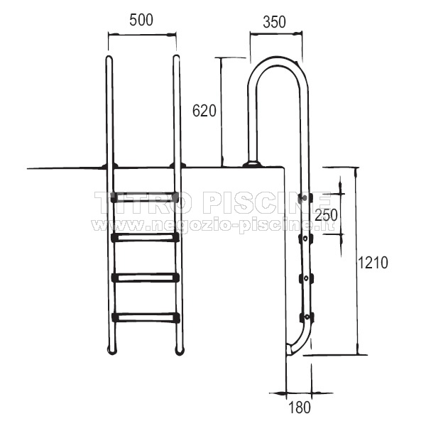 Scaletta per piscina stretta in Inox per l'entrata e l'uscita dall'acqua realizzata con tubo del diametro di 43 mm e gradini in inox, qualità AISI 304. È particolarmente adatta al montaggio sul bordo della piscina, soprattutto se si tratta di piscine rialzate da terra.