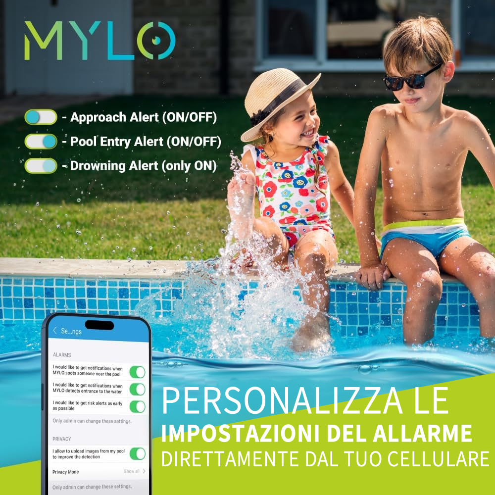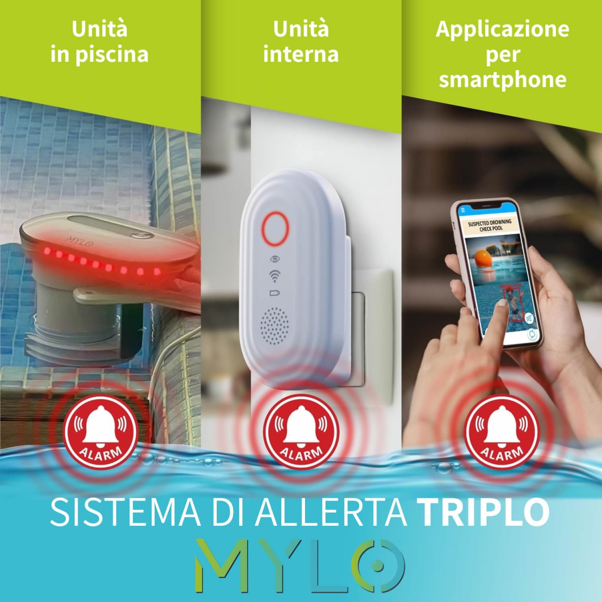 Il sistema ha un allarme integrato nel dispositivo che segnala pericoli nelle vicinanze della piscina. Fa parte del dispositivo anche il modulo che si collega a una presa in casa. Questo modulo serve a segnalare il pericolo quando ti trovi in casa e ci sono persone in piscina. La terza opzione di allarme prevede l'invio di notifiche push ai telefoni cellulari, quindi riceverai una notifica anche quando non sei nelle immediate vicinanze della piscina.