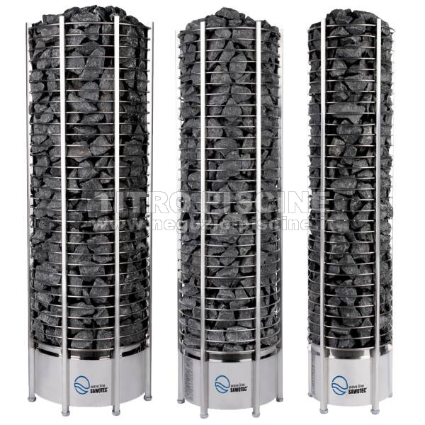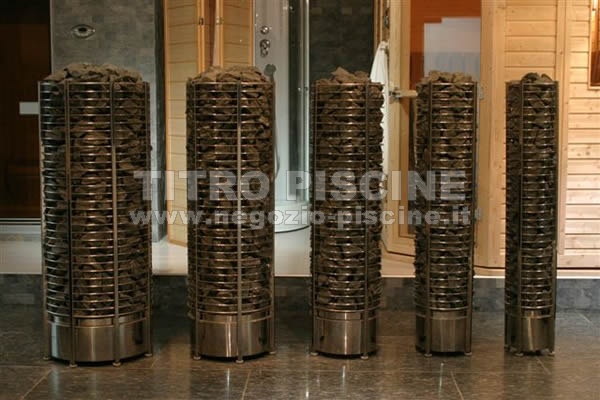 La stufa è realizzata in forma di torre e ha tutt’intorno le pietre a vista. Questo permette di poter versare l’acqua sulle pietre sia da sopra che anche di lato, e quindi ottenere ulteriore umidità. Versando dall’alto l’acqua si sprigionerà un’umidità intensa, mentre versando l’acqua sulla metà inferiore delle pietre l’umidità sarà meno intensa.