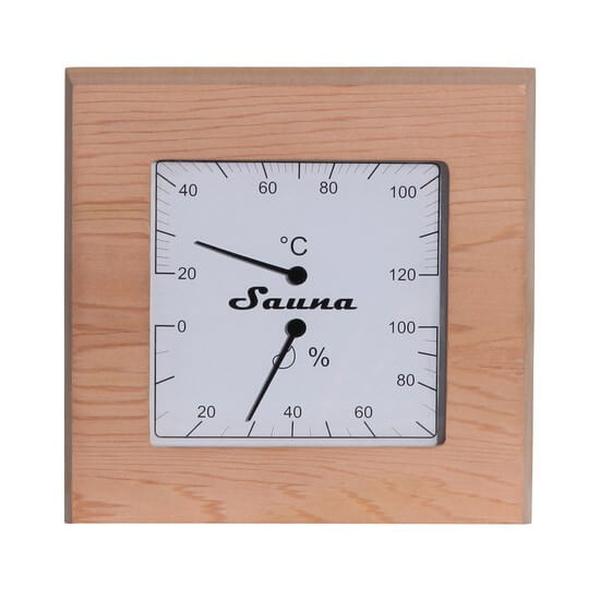 Igrometro e termometro con lancette inseriti in una cornice di legno chiaro quadrata. Fissaggio semplice sulla parete in legno della sauna finlandese (o combinata).
