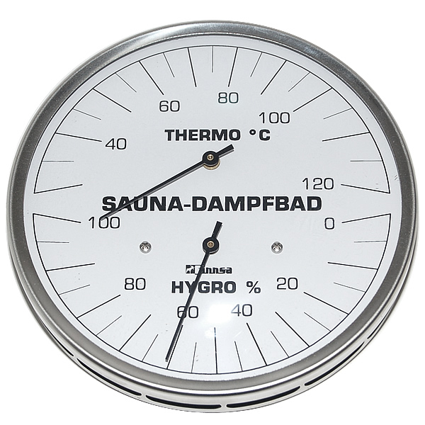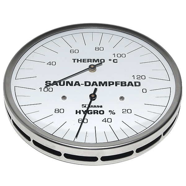 IGROMETRO - TERMOMETRO con lancette e cornice rotonda in metallo, utile per la misurazione della temperatura e del vapore nella sauna. Fissaggio facile sulla base.