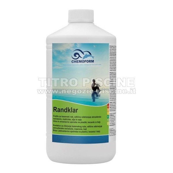 Utilizzo: per la pulizia del bordo della piscina abbassare il livello dell'acqua il più in basso possibile dal bordo da pulire. Mescolate il prodotto Randklar in un secchio di plastica con acqua in proporzione 1:1. Con questa soluzione spazzolate il bordo della piscine, lasciate agire, strofinate nuovamente con un panno spugnoso. Sciacquate poi il bordo con l'acqua. Se si tratta di sporco resistente ripetete la procedura oppure lasciate agire il prodotto più a lungo. Poi strofinate e sciacquate bene con l'acqua.
