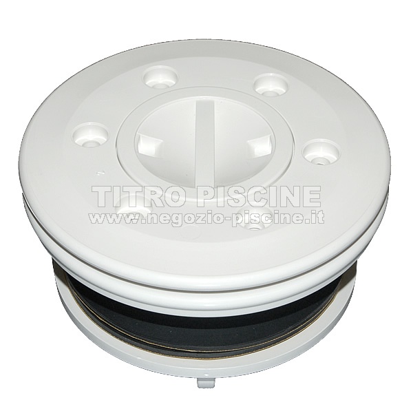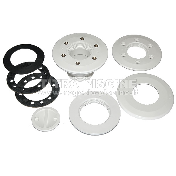 Il kit comprende: flangia con guarnizioni, viti per la flangia, madrevite per il fissaggio sulla parete in metallo (piscine prefabbricate e in pannelli), tappo per la chiusura e coperchio decorativo che potete anche cambiare.